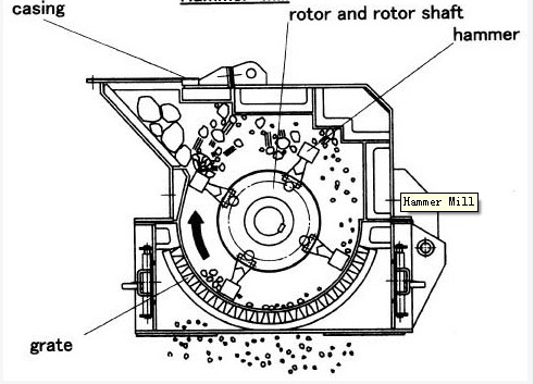 Когда оборудование работает, двигатель приводит главный подщипник в движение, и ролик начинает вращаться. Масса материалов транспортирована в дробильную камеру, ударена и дроблена быстродвижущими молотковами. Потом материалы, которые дролены до нужного размер, через колосниковый грохот собираются как фракции, а другие снова траспортированы в дробильную камеру и повторно дроблены. Влажность материалоы должна ниже 20% в избежении забавания.