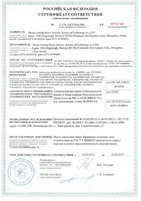 16 марта 2012 года продукции компании Лимин, включая мобильные дробильные установки, стациональные дробилки, вибрационные грохоты, вибрационные питатели, получили сертификаты соответствия ГОСТ Р.