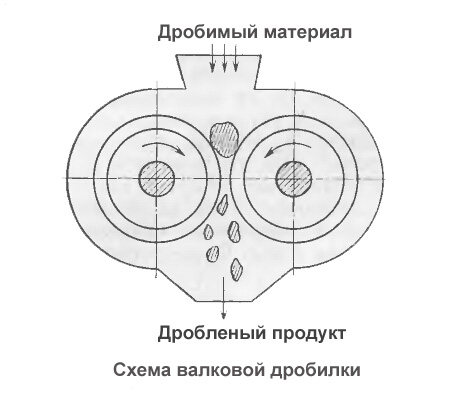 В валковых дробилках измельчение материалов производится между двумя вращающимися на встречу один другому валками путём раздавливания и частичного истирания.. Дробимый материал, поступивший в пространство между валками сверху, затягивается ими и дробится. Дробленый продукт выпадает из дробилки под действием силы тяжести.